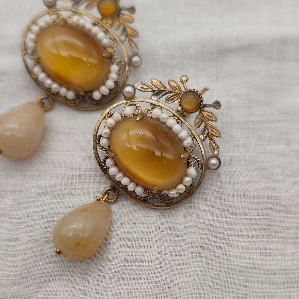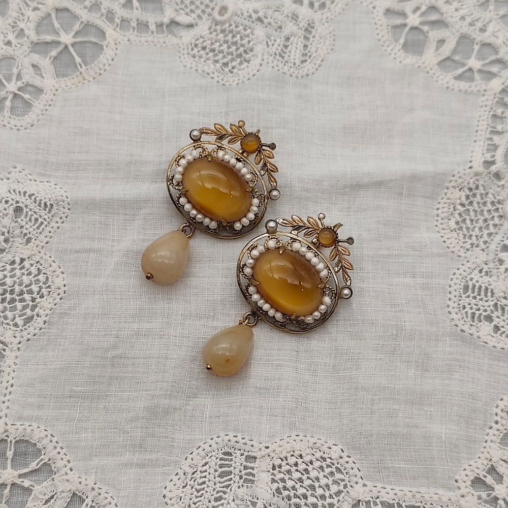Chaque boucle s’articule autour d’un cabochon ovale aux teintes miel et ambrées, délicatement translucide, entouré d’un halo de fines perles blanches qui accentuent sa luminosité. La monture en métal à patine ancienne est richement travaillée de motifs feuillagés et d’ornements étoilés, apportant relief et caractère. Une perle claire ponctue la partie supérieure, tandis qu’une goutte lisse ivoire pâle se balance délicatement en partie basse, créant un contraste doux et harmonieux.