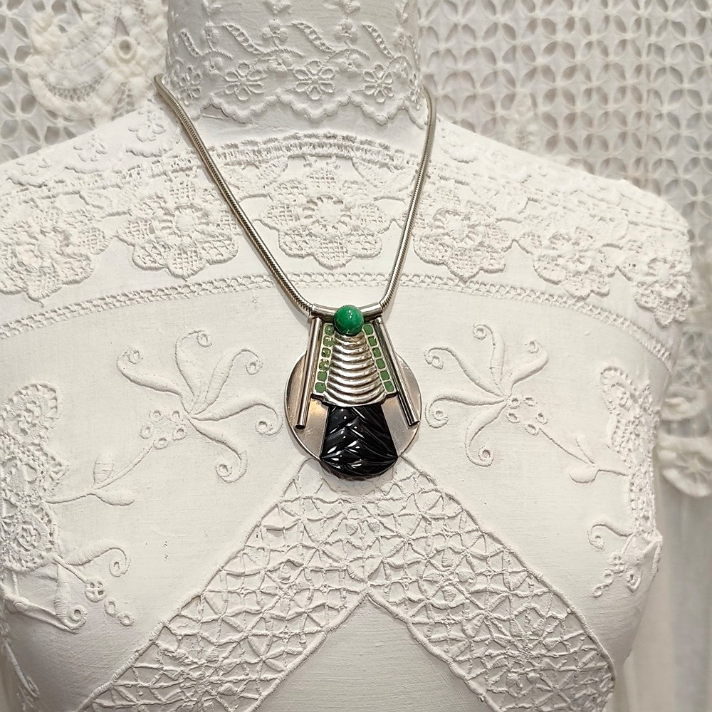 Une pierre verte éclatante trône au sommet, suivie d'une structure en éventail aux ridges horizontaux délicats, ornée de petites pierres vertes rectangulaires. Un trapézoïde de matière noire brillante, gravé de motifs géométriques qui jouent avec la lumière, complète cette composition raffinée. Le tout repose sur un fond circulaire argenté, créant une harmonie visuelle remarquable.